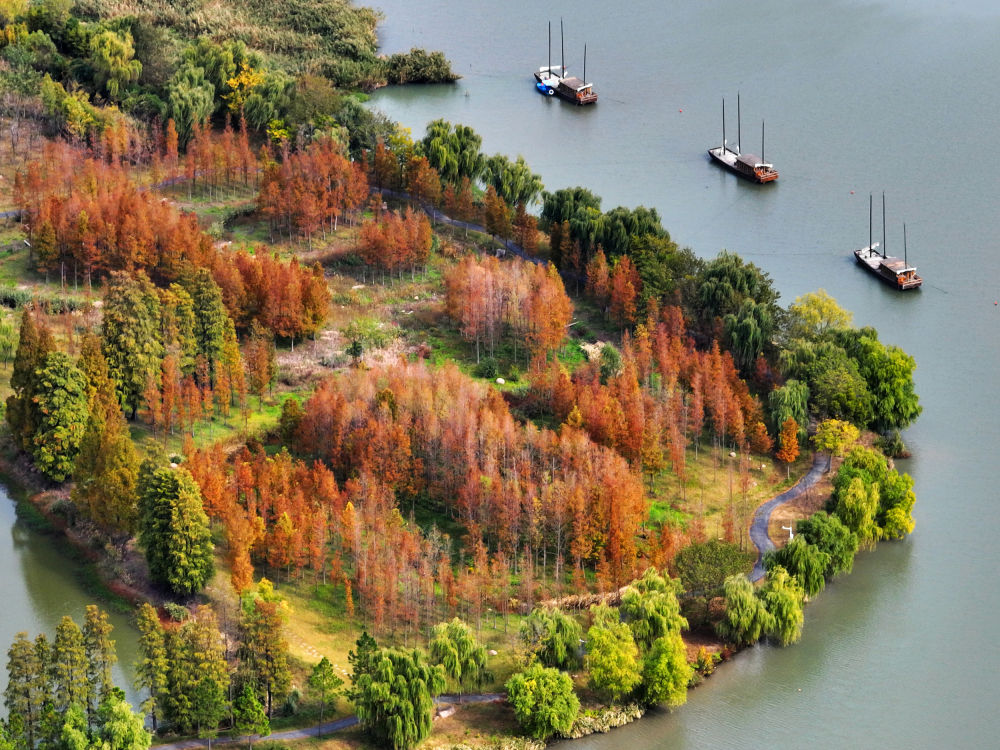 这是11月4日在江苏省扬州市运河三湾景区拍摄的秋景(无人机照片)。新华社发(孟德龙 摄)