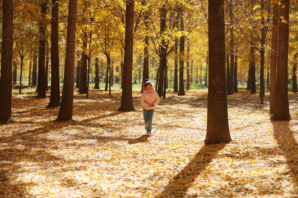 11月4日,小女孩在山东省临沂市郯城县胜利镇贾湾村银杏林中玩耍。新华社发(张春雷 摄)