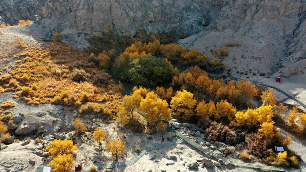 这是10月30日在甘肃省敦煌市悬泉置遗址悬泉谷内拍摄的秋景(无人机照片)。新华社发(张晓亮 摄)