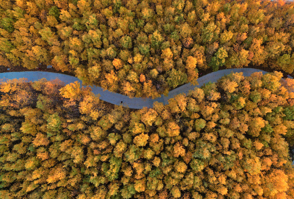 11月4日,市民在山东省威海市羊亭河湿地公园观赏秋叶(无人机照片)。新华社发(朱春晓 摄)