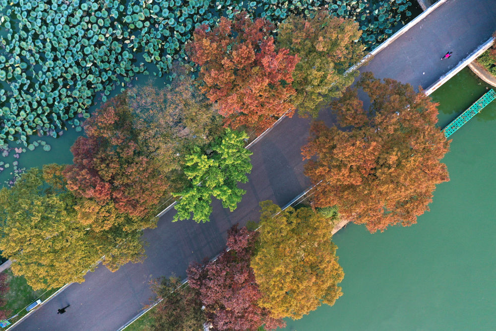 11月2日,市民在江苏省南京市玄武湖公园长堤上赏秋健身(无人机照片)。新华社发(杨素平 摄)