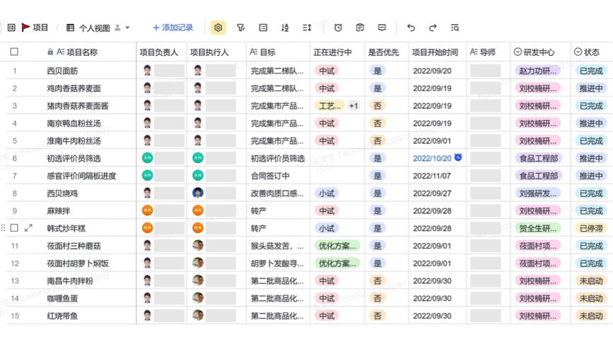 “莜面鱼鱼”“莜面村三种蘑菇”“胡萝卜焖饭”……只见数百个产品研发项目在多维表格里清晰排列,项目负责人、完成进度、优先级一目了然。