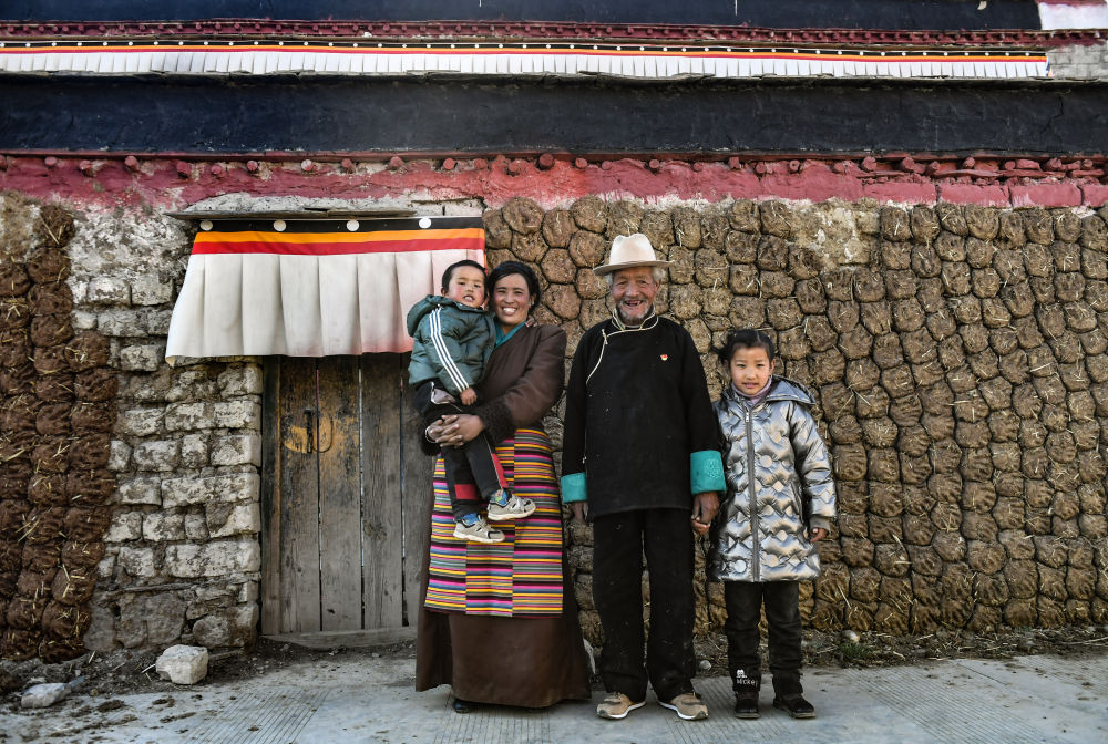 达国杰(右二)和家人在家门前合影(2021年3月22日摄)。新华社记者 孙瑞博 摄