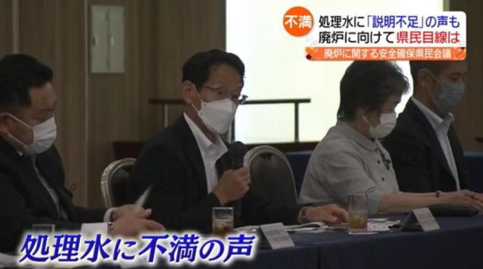 当地时间13日下午,日本福岛县民众召开会议,参加者针对日本政府计划在今夏正式向大海排放核污水一事表示不满。图片来源:福岛中央电视台视频截图