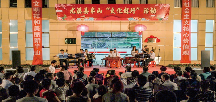 近年来,尤溪县半山村成立新时代文明实践领导小组,在重要的时间节点,通过“旅长村支书”带头讲、“新时代文明实践号”流动播、微信公众号和抖音账号线上传等方式,结合“春节三天乐”、重阳敬老宴等“文化赶圩”活动,使党的理论政策宣传入脑入心。图为2017年7月,半山村农民乐队等民间艺术团在游客中心举办“文化赶圩”活动。(地方媒体供图)
