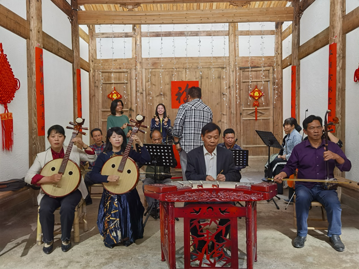 尤溪县半山村新知青艺术公社探索建立高校联盟,将高校学子的社会实践与乡村建设紧密相连,带领大学生来到乡村,指导他们共同为村民培训短视频直播、参与新型农民的精神建设等。图为2022年6月,尤溪职业中专学校与半山村民间艺术团开展“新知青艺社高校联盟‘艺术助力乡村振兴’——走进半山”活动。(地方媒体供图)