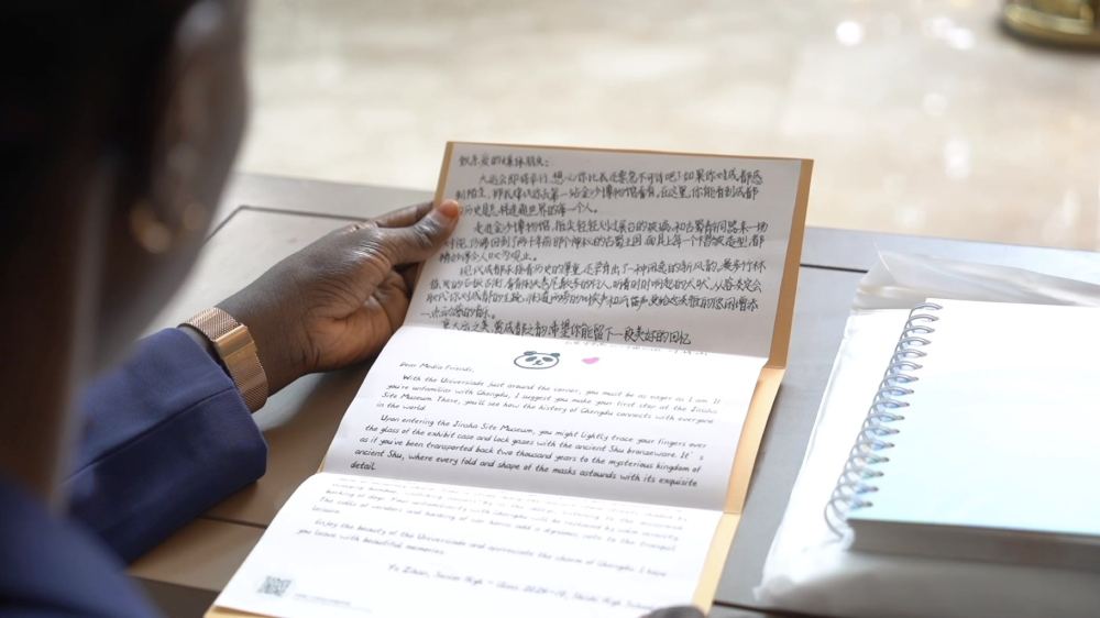 7月27日,塞内到达成都大运会媒体酒店,从前台拿到媒体包。她一件件掏出包里的物品:媒体指南、笔记本、雨衣……还有一张三折硬卡纸,封面上一行银色小字“一封给媒体记者的信”。褪下封套,抚平信纸,塞内的好奇顷刻转为欣喜——居然是一封中英双语手写信,还画着大熊猫和一颗红心。