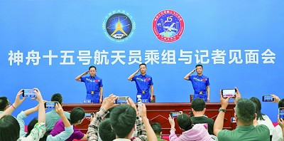 7月31日,航天员费俊龙(中)、邓清明(右)、张陆在见面会上敬礼致意。新华社记者 郭中正摄