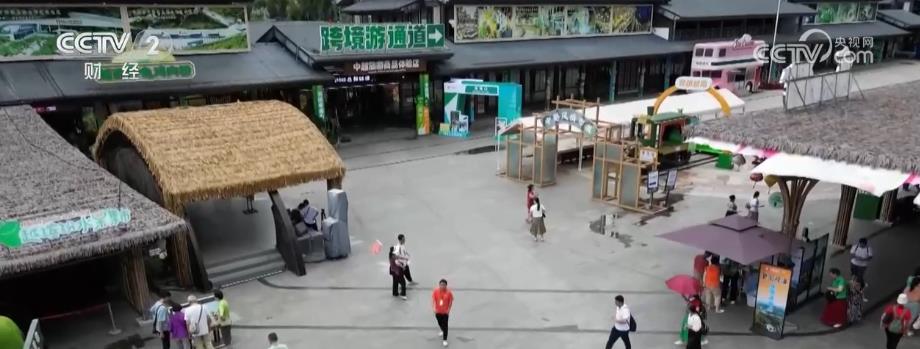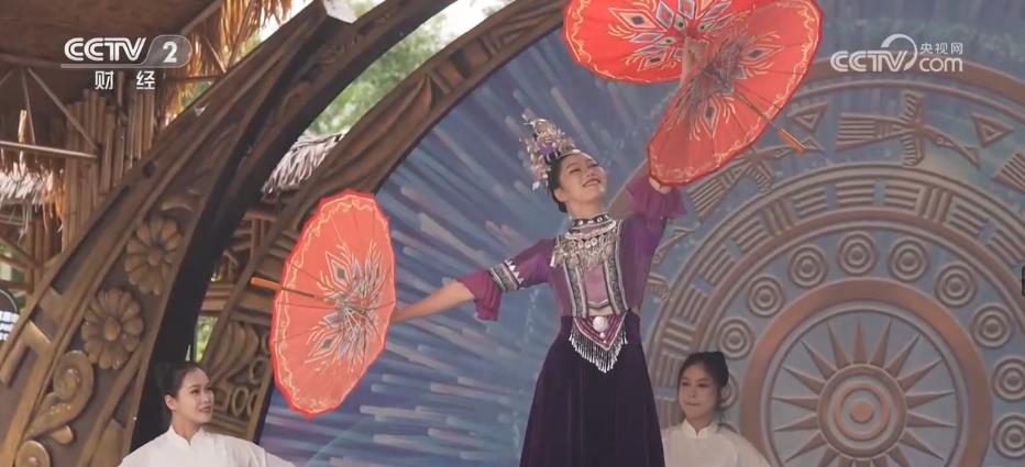 总台记者 杨祉禛:中越风情街的建筑在设计上融入了壮族对蛙的崇拜,旁边就有一个“蛙神巢穴”,游客可以在这里聆听水声潺潺,听取蛙声一片。除此之外,游客可以在法棍博物馆品尝到越南法棍,沿路感受越南春卷、越南水果捞、广西酸嘢的风味。继续往前到中越跨境街,还能欣赏中越风情舞蹈,获得充满壮乡和越南特色的沉浸式消费体验。