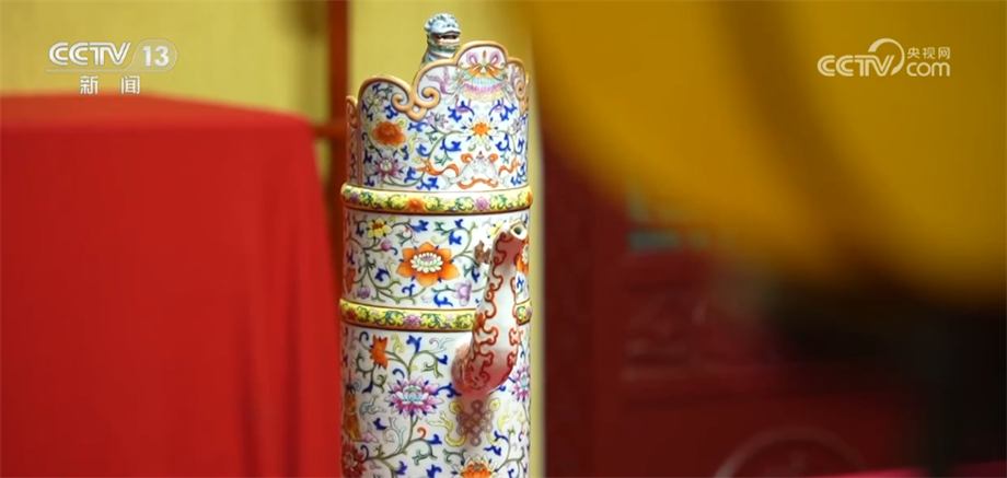 总台记者 杨雪:沈阳故宫当中的很多珍贵院藏文物都见证了多民族文化融合的过程,像我们眼前看到的这款清乾隆款粉彩多穆壶就是其中之一。多穆在藏语当中是奶茶桶的意思,直到现在,像铜制、木制、皮质的很多多穆壶仍然被蒙、藏等少数民族沿袭使用着。大家可以看到,这款多穆壶的盖子上蹲坐着一只非常灵动的小狮子,有祈福和护佑主人的意思。这件多穆壶是国家一级文物,距今已经有200多年的历史了。