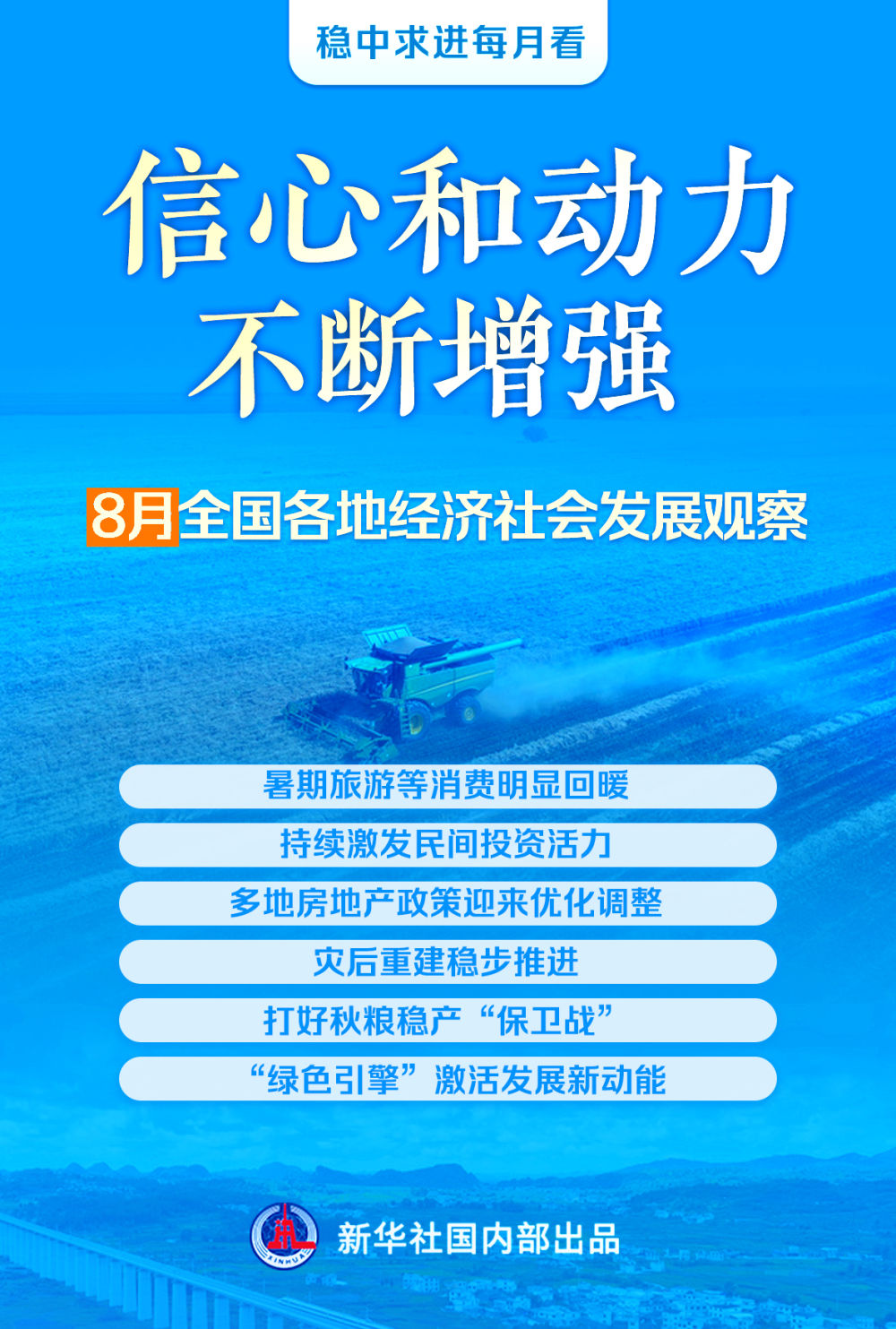 8月,在党中央部署下,各地各部门陆续出台一系列促发展的政策举措。记者近期走访发现,贯彻落实中央部署,全国各地鼓足干劲、真抓实干,政策“组合拳”精准发力效果持续显现,发展信心和动力不断增强。