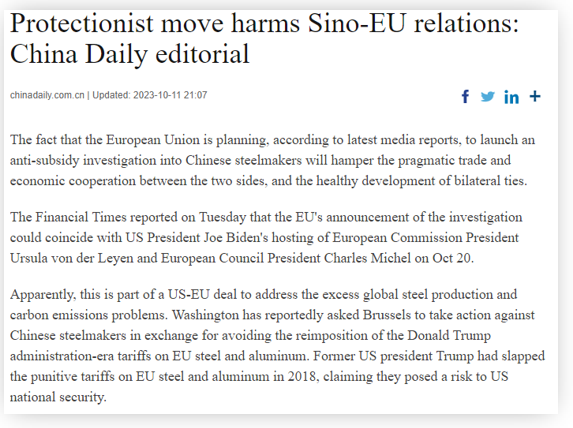 早在2021年,美国和欧盟发表关于全球钢铝产能过剩和碳减排领域的联合声明,此次计划对中国钢铁企业展开调查,显然是其中一部分。有媒体报道称,美国政府此前还曾以不恢复对欧盟征收钢铁关税为条件,要求布鲁塞尔对中国钢铁企业采取定行动。