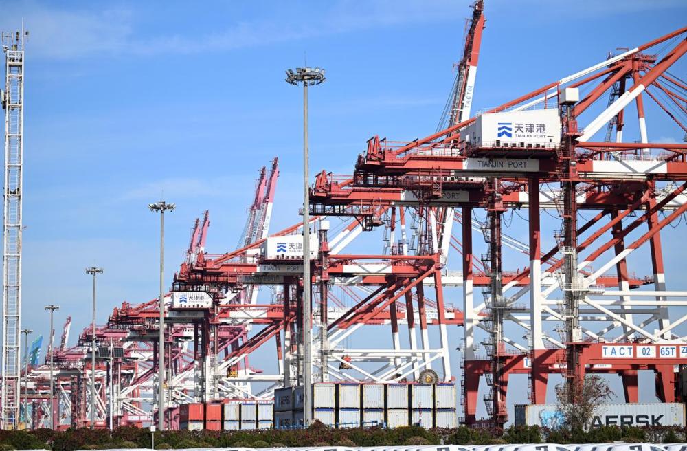 11月13日,集装箱货轮停靠在天津港欧亚国际集装箱码头。
