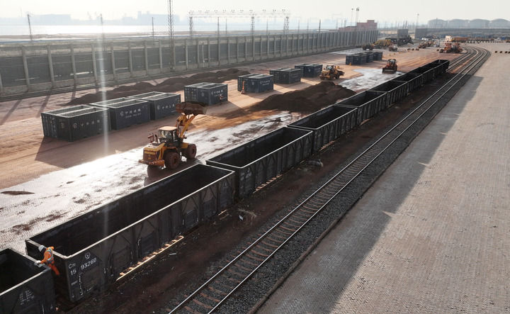 11月13日,在天津港“公转铁”“散改集”双示范基地内,铲运机在将铁矿石装入集装箱内。