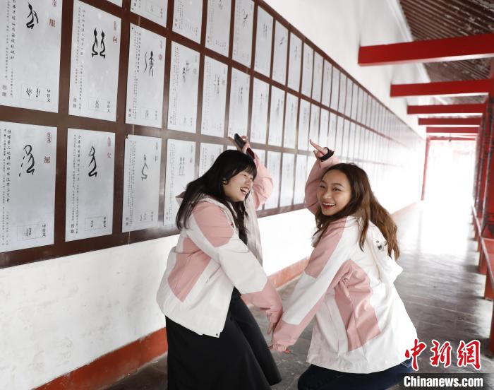 在殷墟遗址“甲骨长廊”,来自台北商业大学的柯俐安和吴安琪不时摆出甲骨文造型,两人在“向”字前牵手半蹲,“你看这个字像两个人面对面而坐,可能有方向的意思”。
