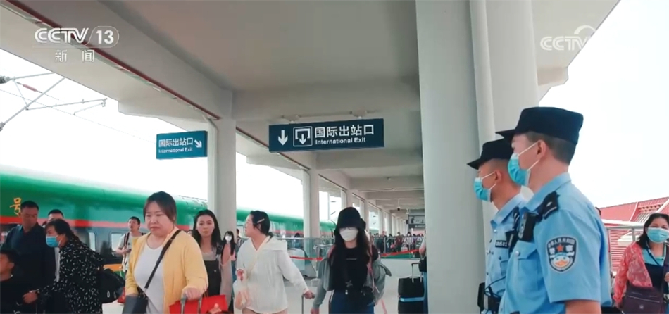 在磨憨站,出入境人员熙熙攘攘,异常热闹,来自不同国家和地区的旅客有序通过国际安检区并经海关查验后,在磨憨边检站铁路口岸执勤专班民警指引下排队、核验证件,顺利通关。