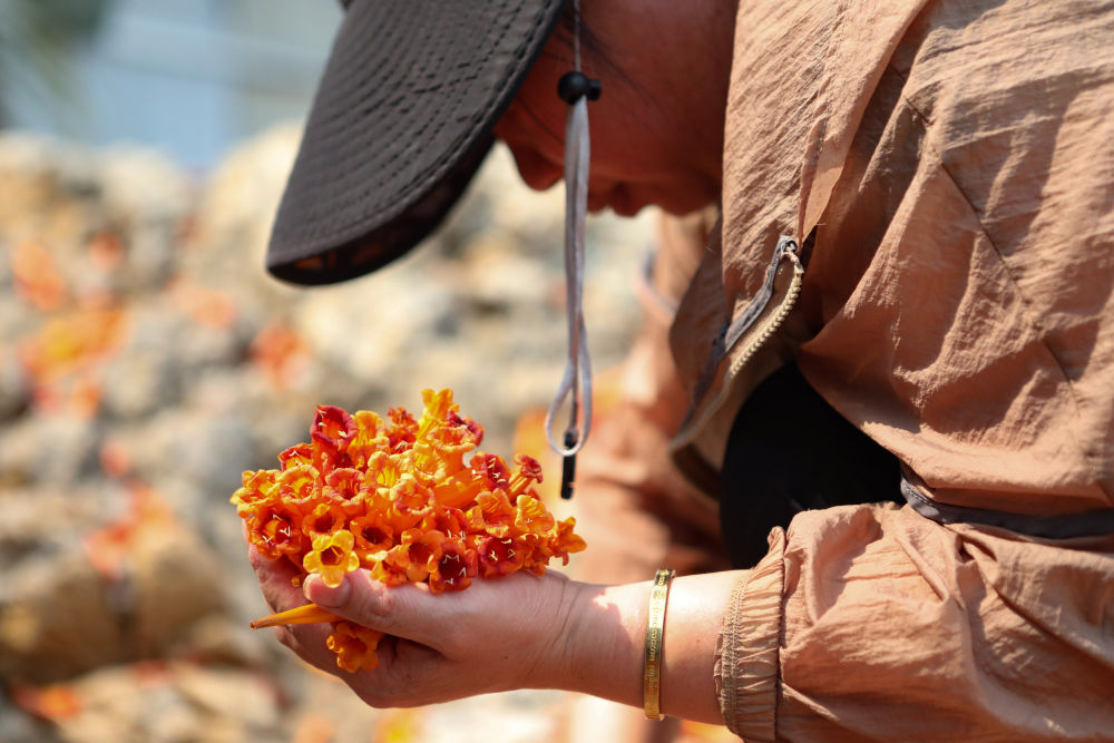 云南省景洪市嘎洒街道的居民在收集火烧花(3月17日摄)。 新华社发(李云生 摄)