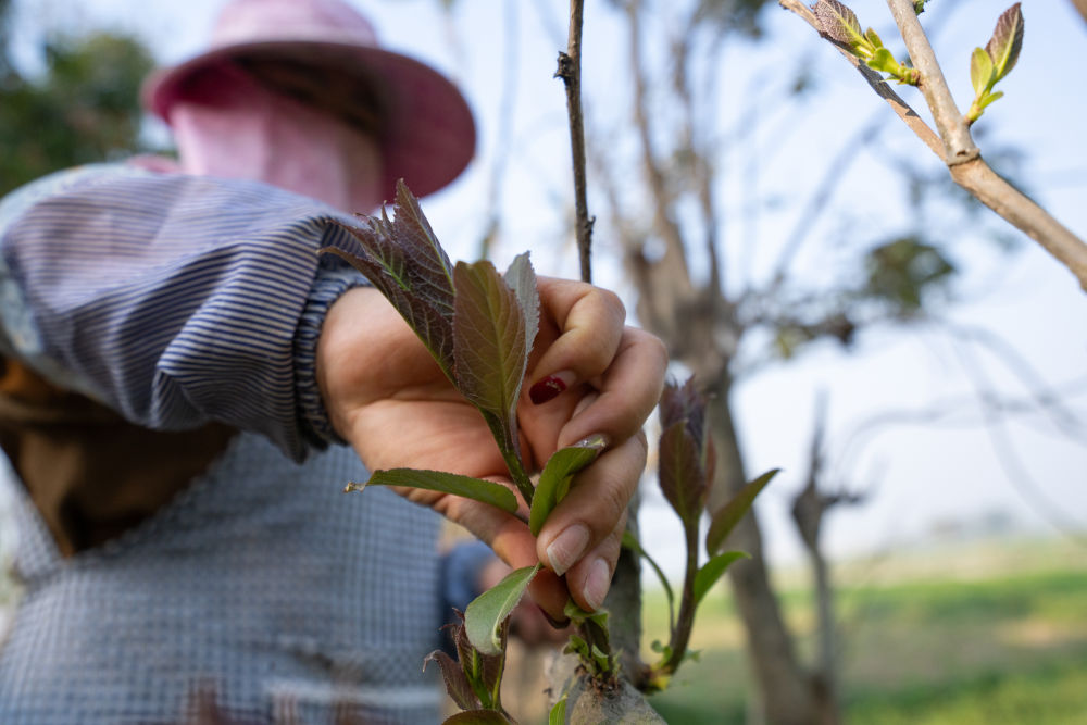 云南省德宏傣族景颇族自治州芒市的村民采摘厚壳树的新芽(3月17日摄)。 新华社发 (张仁韬 摄)