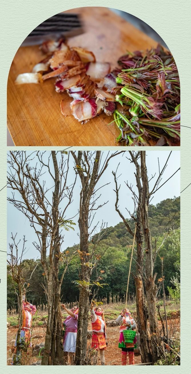 香椿从树上到餐桌,变成香椿炒腊肉。 新华社发(熊平祥 摄)