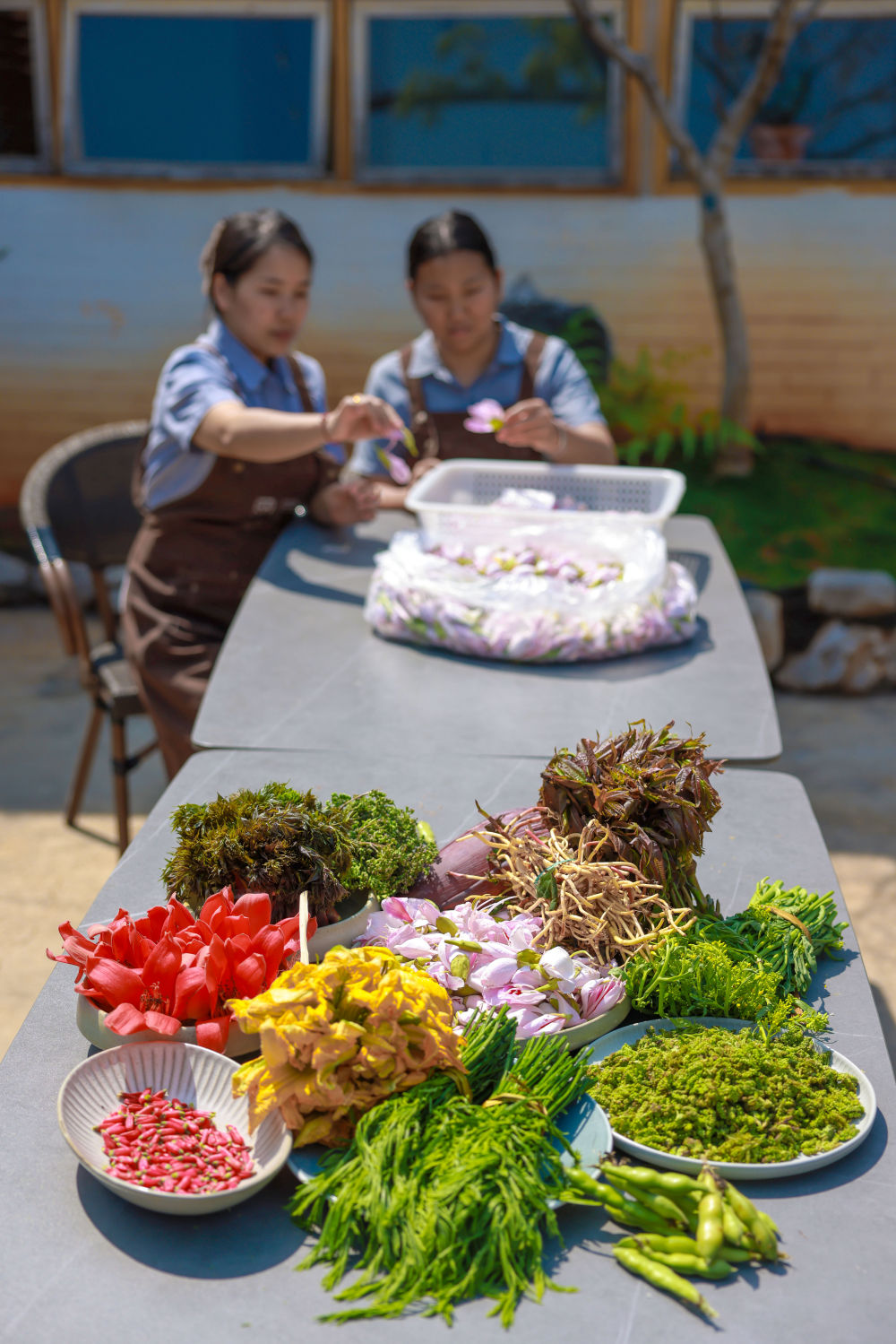云南省红河哈尼族彝族自治州开远市一家餐馆里,服务员分拣早市买来的鲜花野菜(3月18日摄)。 新华社发(陶家淇 摄)