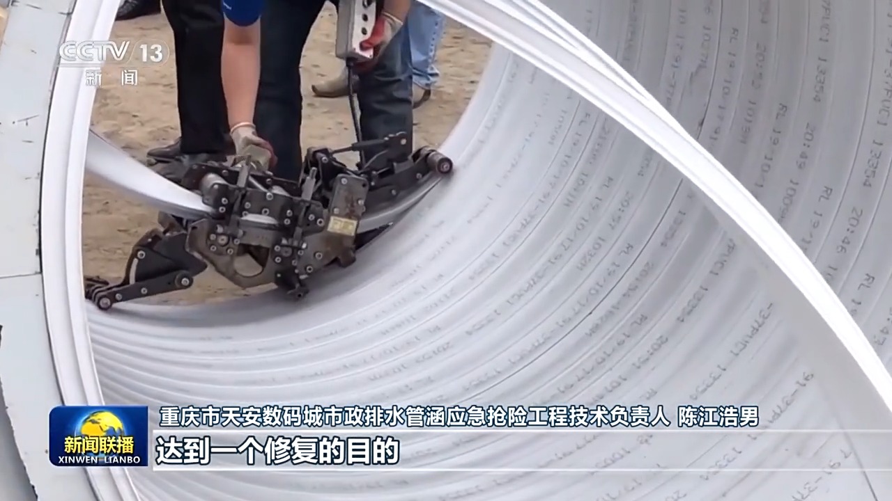 重庆市天安数码城市政排水管涵应急抢险工程技术负责人 陈江浩男:它是一个集成的管道机械螺旋缠绕机,是将一种带状的型材,在旧的管道内通过这个机器给它缠绕成一种新的管道,达到一个修复的目的。
