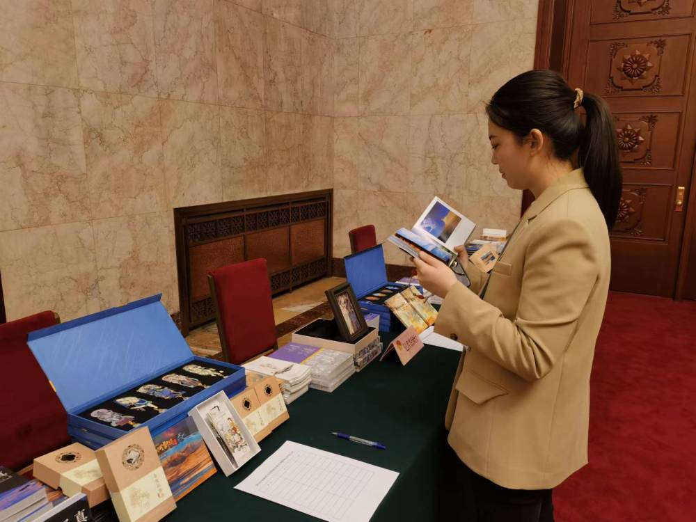 人民大会堂新疆厅门口,新疆代表团精心准备的新疆桑皮纸书签等非物质文化遗产文创产品,受到中外记者欢迎。