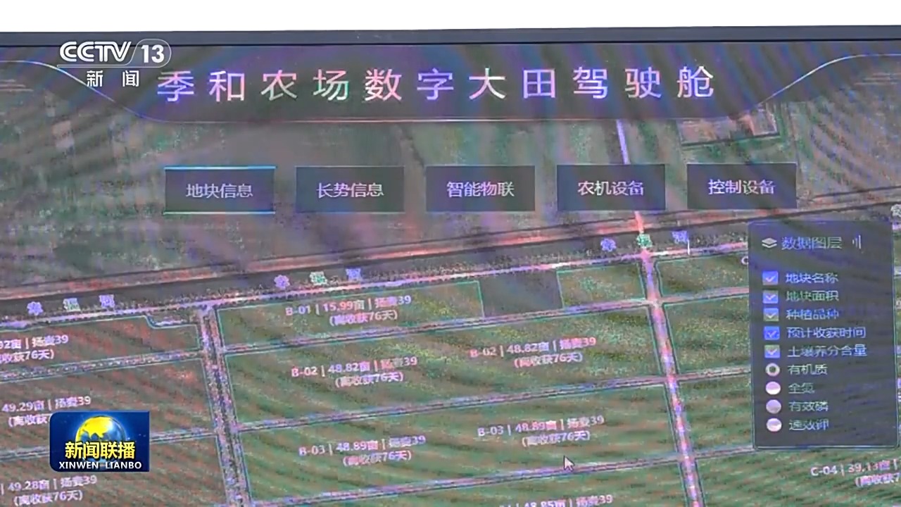 总台央视记者 蒋树林:这里是江苏南通海安的季和农场,这块大屏是整个农场数字大田的智慧大脑。在这里每一块地拥有自己的专属信息和数字编码,就像我们的身份证一样。