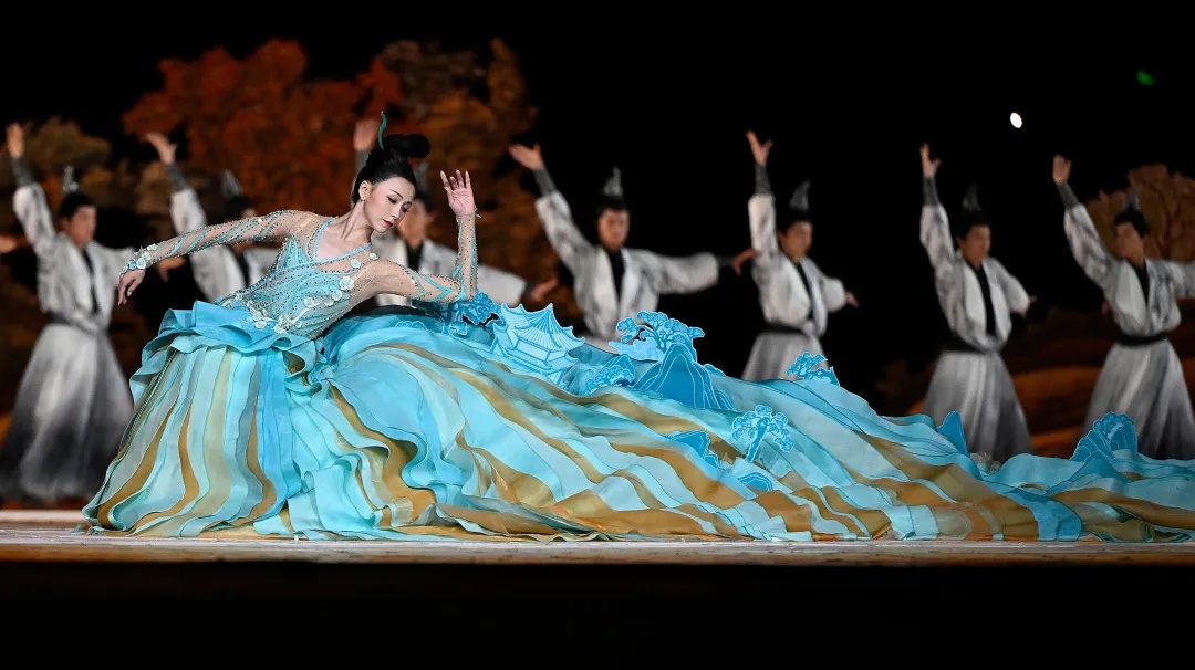 (杭州亚运会开幕式,舞蹈演员身着“水天碧”长裙起舞。新华社记者宋彦桦摄)