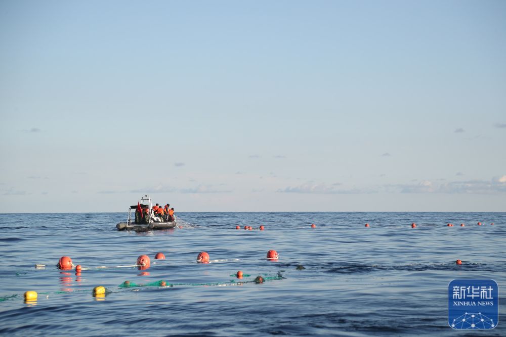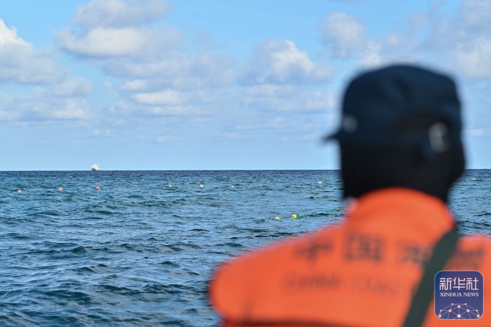 ↑5月16日,中国海警局赤瓜舰执法员在仁爱礁及其附近海域查看中国渔民所放渔网。新华社记者 李鑫 摄