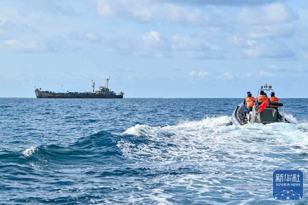 ↑5月16日,中国海警局赤瓜舰执法员在菲律宾非法“坐滩”军舰附近巡查。新华社记者 李鑫 摄