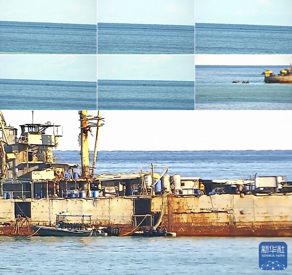 ↑这是5月16日拍摄的菲律宾非法“坐滩”军舰人员乘小艇在仁爱礁及其附近海域切割并盗走中国渔民所放渔网的过程(拼版照片)。新华社发