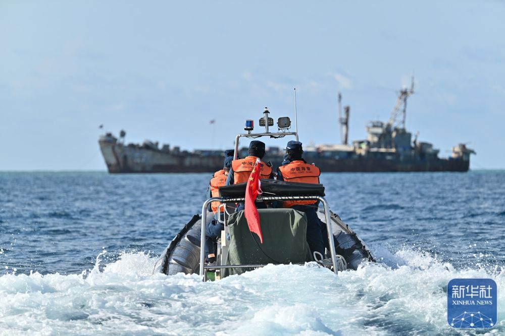 ↑5月16日,中国海警局赤瓜舰执法员在菲律宾非法“坐滩”军舰附近巡查。新华社发(石磊摄)