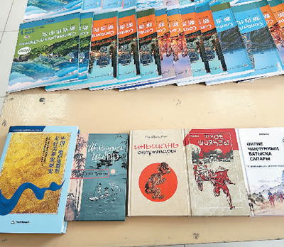 在孔子学院文化活动室桌面上,摆着几本用哈萨克语翻译的中国书籍,《边城》《骆驼祥子》《长春真人西游记》《阴山汪古》等等。