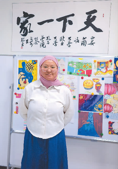学生丽扎·穆罕默德在孔子学院书画墙前留影。