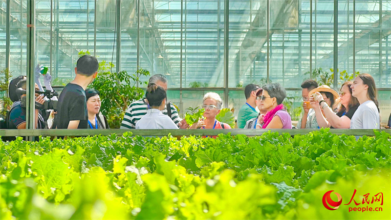 在新疆昌吉农业博览园,中外汉学家、翻译家、作家参观新疆现代农业种植情况。人民网 李欣洋摄