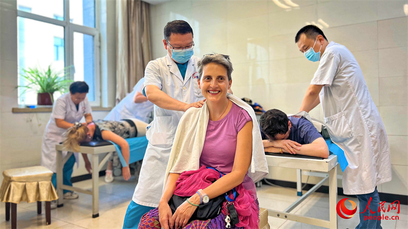 在新疆医科大学一附院(昌吉分院),中外汉学家、翻译家、作家参观中医馆,体验中医文化。人民网 李欣洋摄