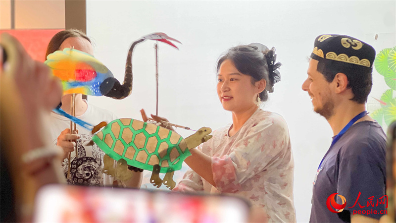 俄罗斯翻译家、现任莫斯科物理技术学院中文系副教授罗子毅与皮影合影。人民网 李欣洋摄