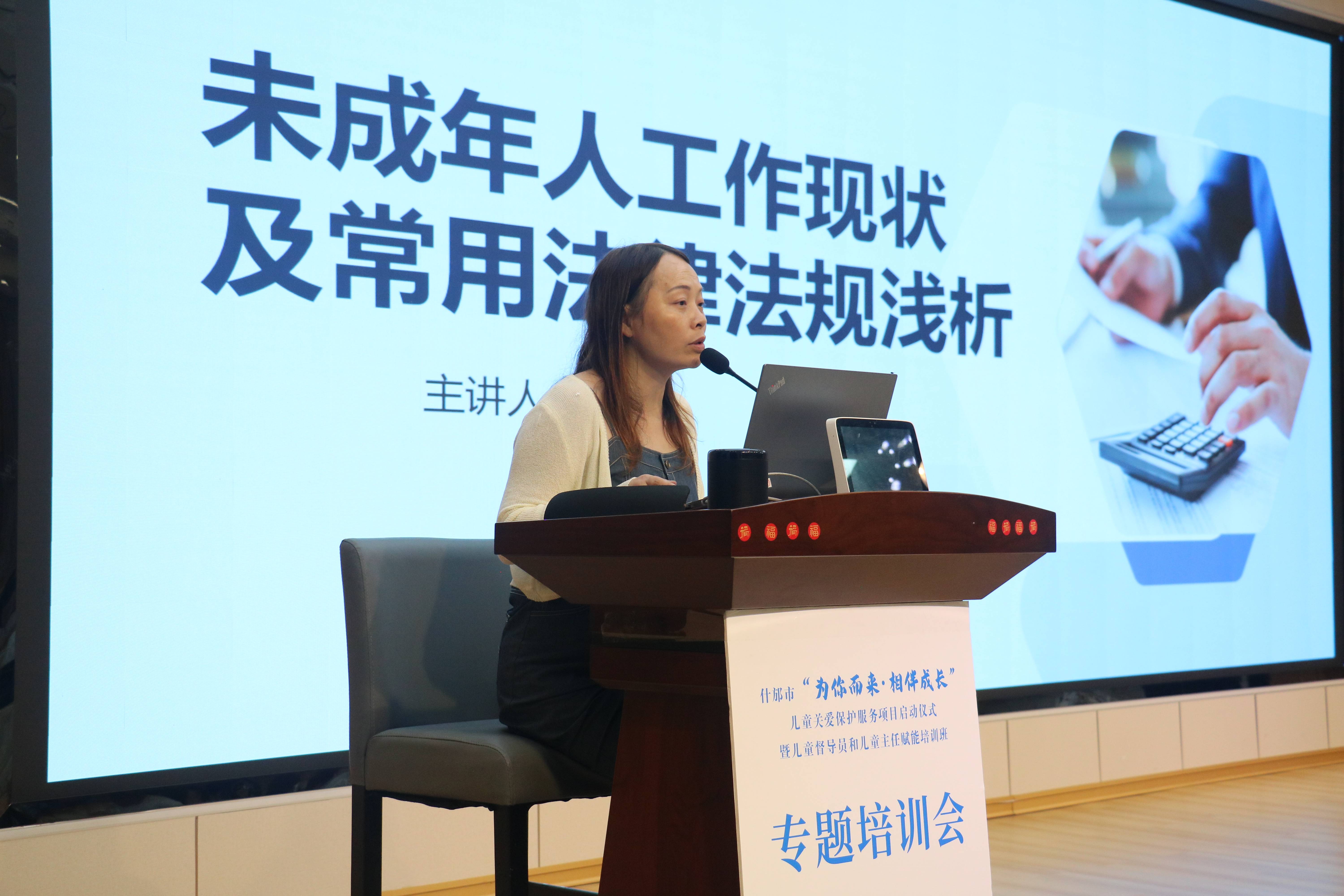 此次培训特邀成都市高级社工督导、成都市未成年人救助保护区域督导、邛崃市未保专家库专家李夏作《未成年人工作现状及常用法律法规》《未成年人保护工作沟通技巧与实务案例分享》专题培训。她围绕未成年人保护现状、未成年人保护工作面临的问题和困境、未成年人保护相关法律法规等内容作专业细致的分享,用大量翔实、生动的案例、数据,向儿童督导员和儿童主任阐述了未成年人保护工作的重要性和复杂性,帮助儿童督导员与儿童主任进一步掌握科学有效的工作方法。