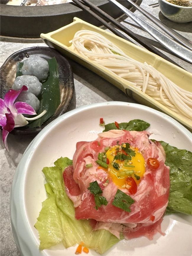 根据服务员的推荐,陈琳夫妇还特别点了墨鱼滑老油条和鲜潭捞肥牛两道创意菜品。墨鱼滑与老油条的组合,外酥里嫩,口感层次丰富;而肥牛裹上鸡蛋液的做法,则使得肉质更加滑嫩,每一口都是满满的幸福感。这些新颖的搭配不仅让陈琳一家人大快朵颐,也成了此次聚餐的一大亮点。
