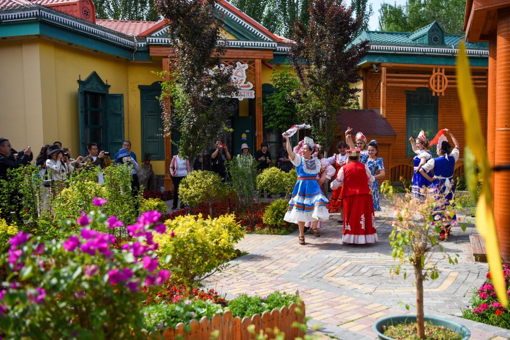 在新疆伊犁哈萨克自治州伊宁市六星街,当地居民跳起舞蹈欢迎远方来客。新华社记者 丁磊 摄