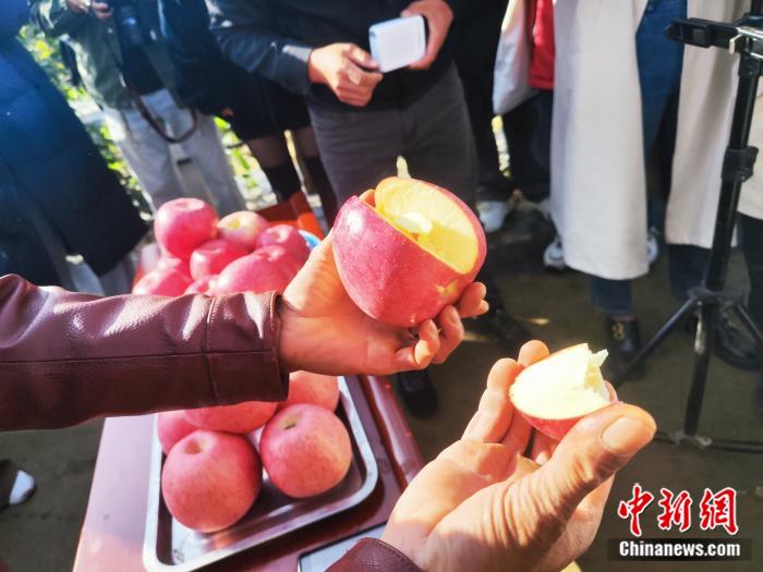 村民赵生生向记者们展示汁水丰盈、清甜味美的南沟村苹果。刘越 摄