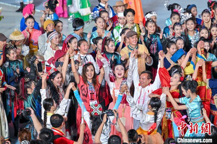 11月26日晚,民族大联欢文艺演出结束后,演员与运动员一起互动自发起舞献技,场面热闹温馨。中新网记者 骆云飞 摄