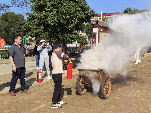 随后,肖育锋副校长详细讲解了消防安全的重要性、火灾的危害以及正确的逃生知识。他特别强调了掌握灭火器使用方法的重要性,并现场演示了如何正确使用干粉灭火器。在肖育锋副校长的指导下,两位学生代表也亲自上阵,利用灭火器成功扑灭了燃起的火焰,赢得了在场师生的阵阵掌声。