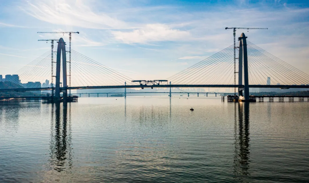 为确保主桥顺利合龙,项目团队发挥专业优势,采用国内首创的多功能梁板铺架一体机,不仅可以实现主桥钢混组合梁吊装作业,也实现了桥面板、斜拉索的同步施工,降低现场施工组织难度,提高了钢梁、桥面板、斜拉索的施工工效,大幅缩短施工工期,助力项目建设跑出加速度。