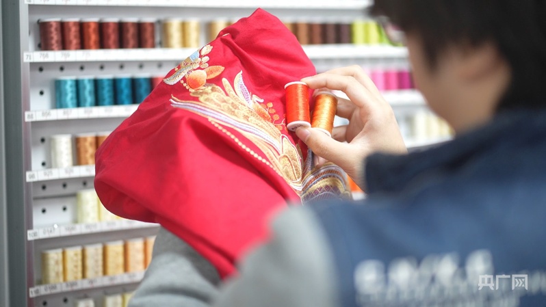 家纺企业内,设计师在众多绣花线中选色(央广网记者 王姝姝 摄)