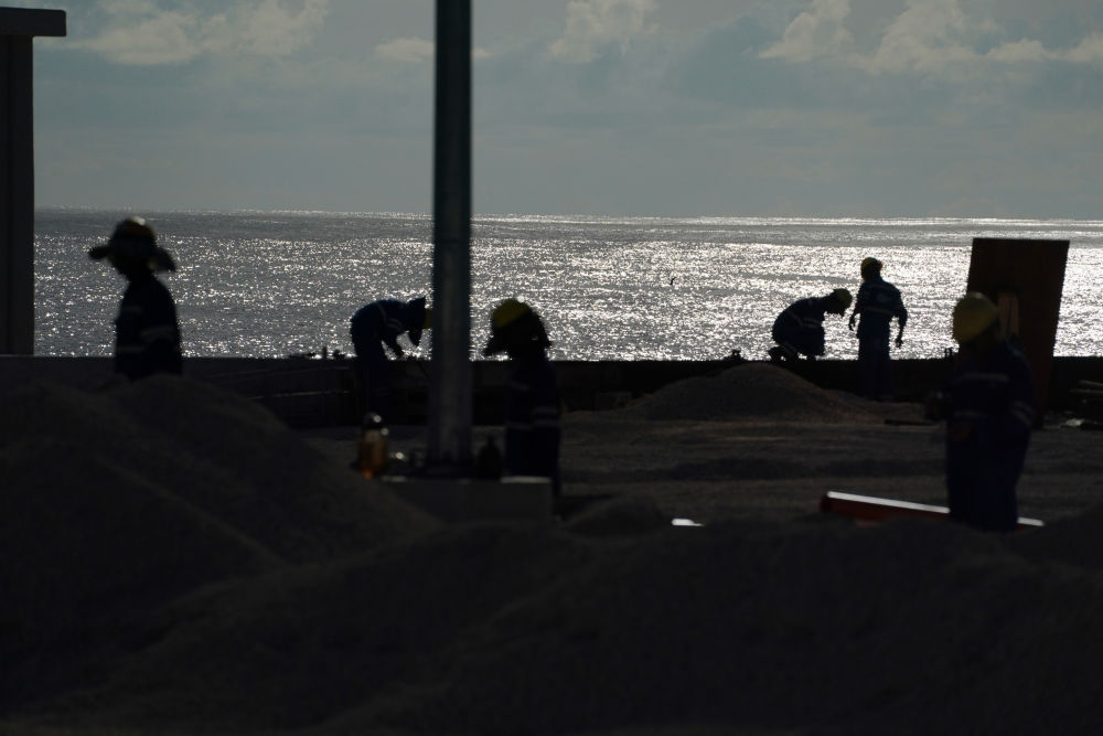 2024年1月18日,工作人员在瑙鲁艾沃港码头升级改造项目工地工作。新华社记者王申摄