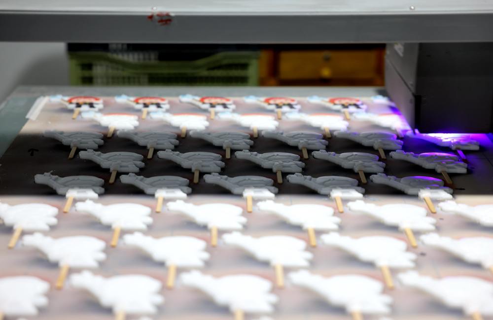 在百花烛业倒模车间,还保留着传统的手工艺制作:熔化石蜡、浇筑蜡水、等待冷凝、剔除多余蜡块……和传统工艺不同的是,工人们会根据不同客户的需求,为每个蜡胚打印、上色“化妆”。