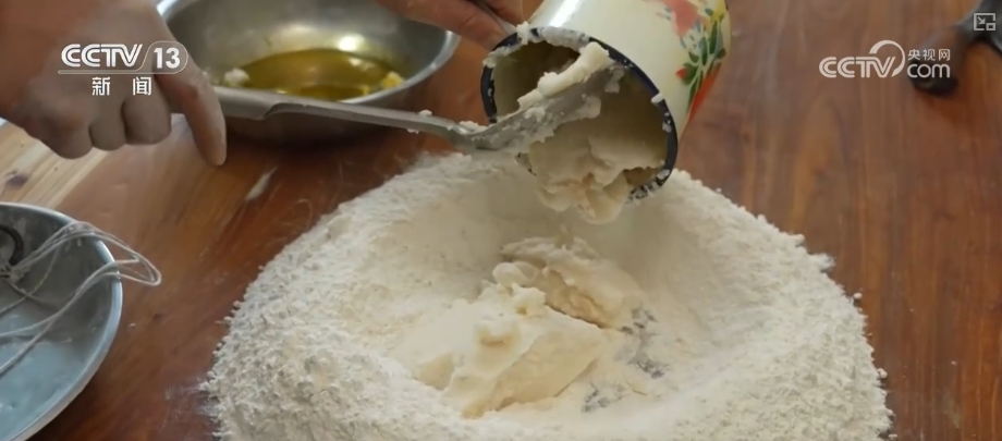 按比例调配白面与猪油,充分搅拌均匀后揉团。酥油切成大小一致的小块,包在揉好的面团中,然后就要把包了酥油的面团擀制成这样的月牙形。