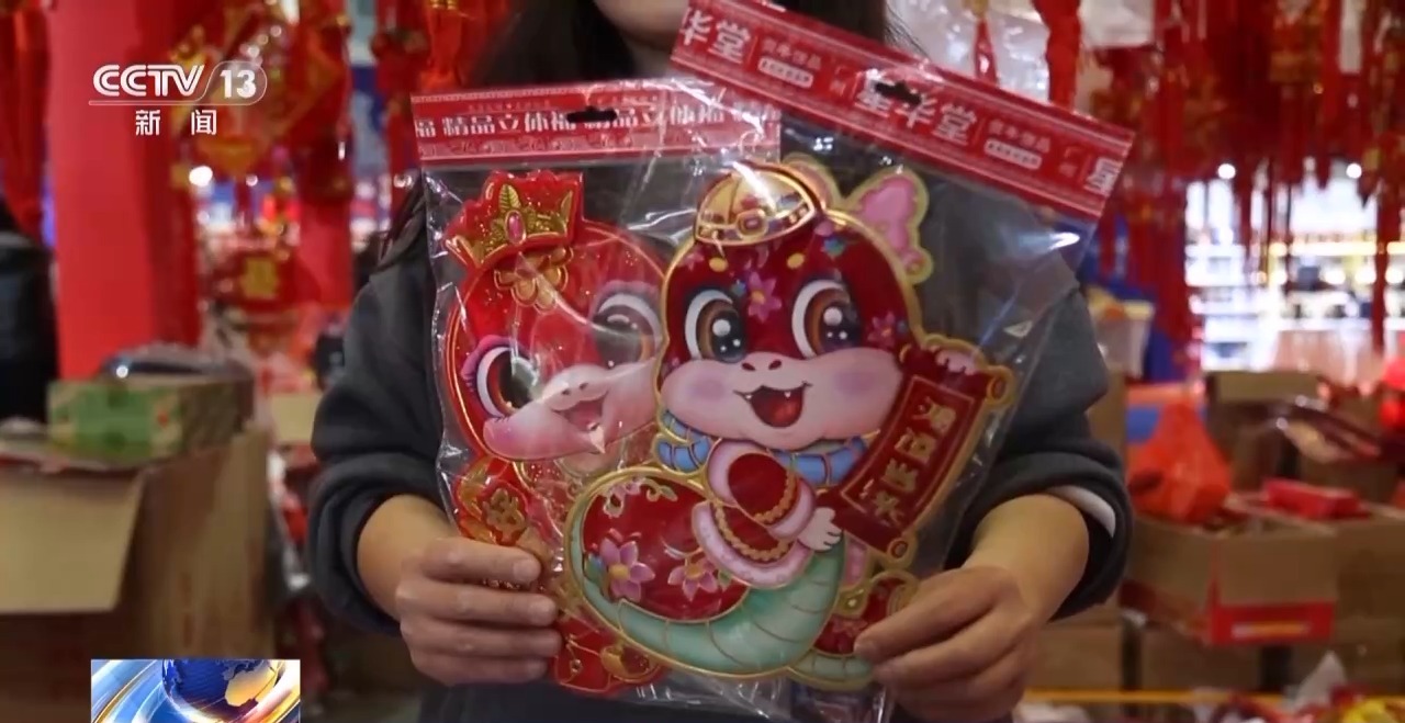 在年货市场上,随处可见生肖蛇年的喜庆元素。蛇年春联也备受消费者喜爱。