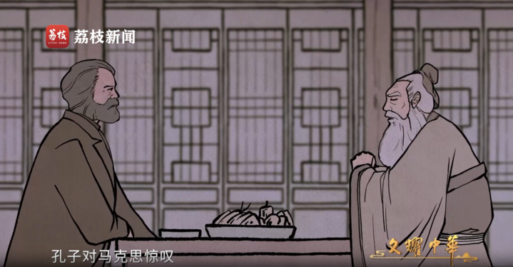 孔子对马克思惊叹:“你这个理想社会和我的大同世界竟是不谋而合。”马克思也对孔子感叹:“我不想在两千年前,在远远的东方,已经有了你这样的一个老同志!”